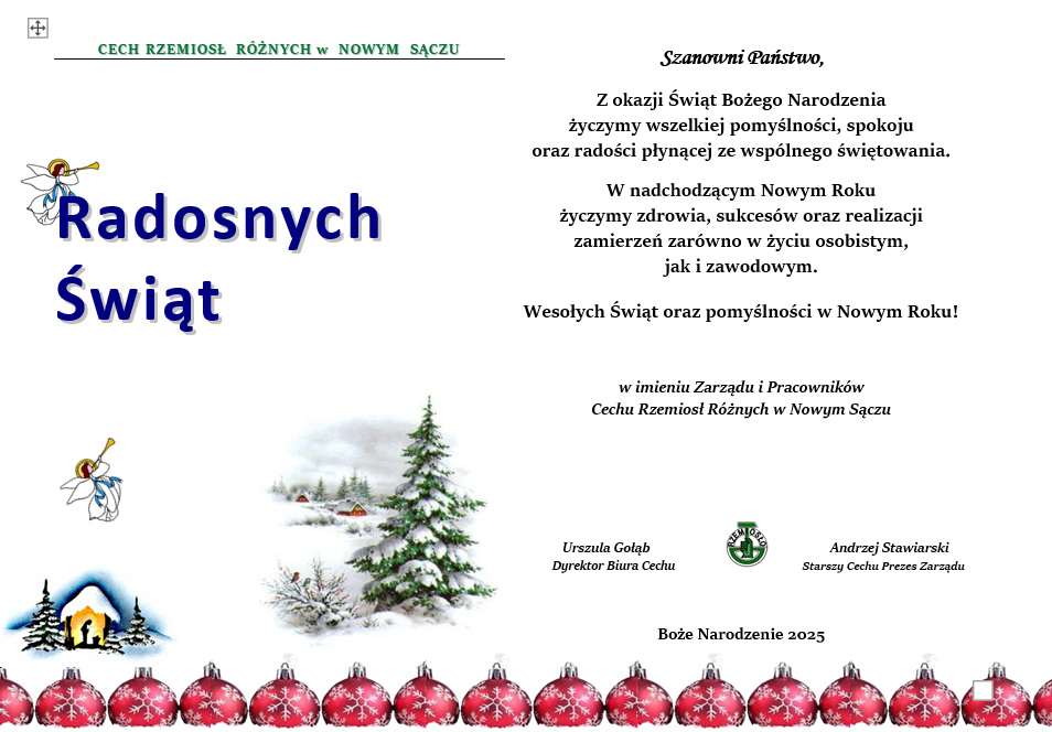 Przekazujemy życzenia Radosnych Świat otrzymane od Zarządu i Pracowników Cechu Rzemiosł Różnych w Nowym Sączu. Dziękujemy.