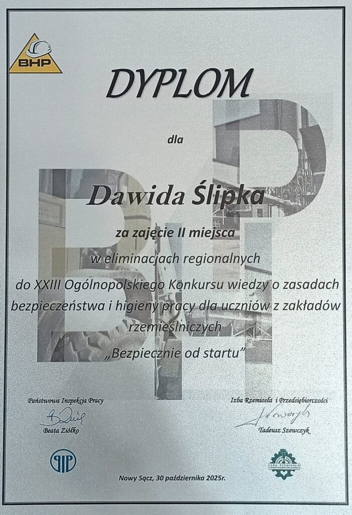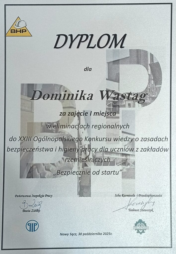 Dominik Wastag i Dawid Ślipek zajęli odpowiednio I i II miejsce w eliminacjach regionalnych do XXIII Ogólnopolskiego Konkursu wiedzy o zasadach bezpieczeństwa i higieny pracy dla uczniów z zakładów rzemieślniczych „Bezpiecznie od startu”. Serdecznie gratulujemy. Dominik i Dawid będą reprezentować nasz region na etapie ogólnokrajowym, który odbędzie się w grudniu w Warszawie.