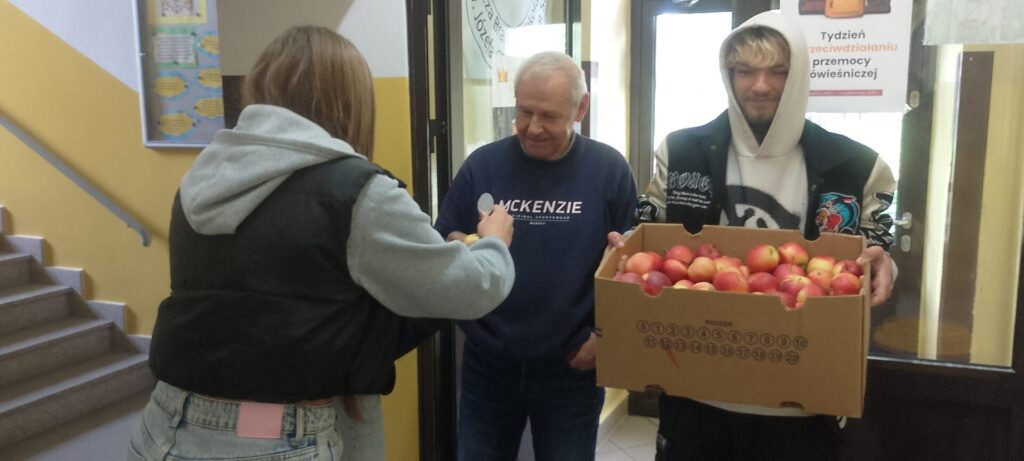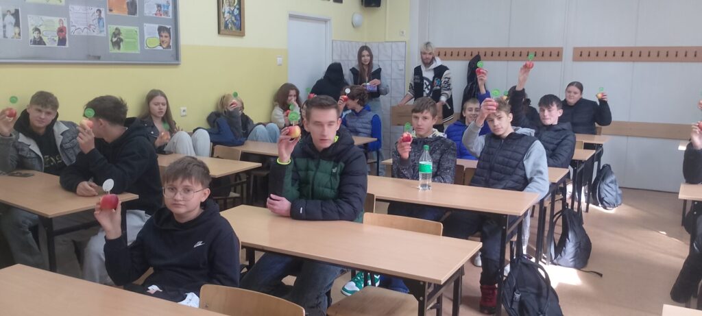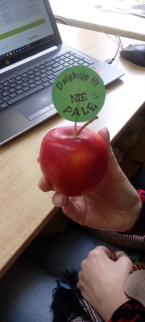Powszechnie wiadomo, że owoce są bardzo zdrowe. Dzisiaj Kamil z klasy IIc wraz z koleżankami przeprowadził w naszej szkole akcję ”Jabłko zamiast papierosa”. Każdy uczeń otrzymał przepyszne, soczyste jabłko z ulotką „Dziękuję nie palę”.