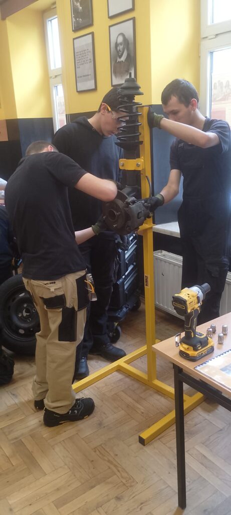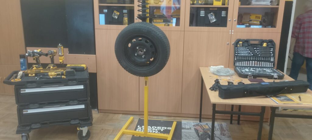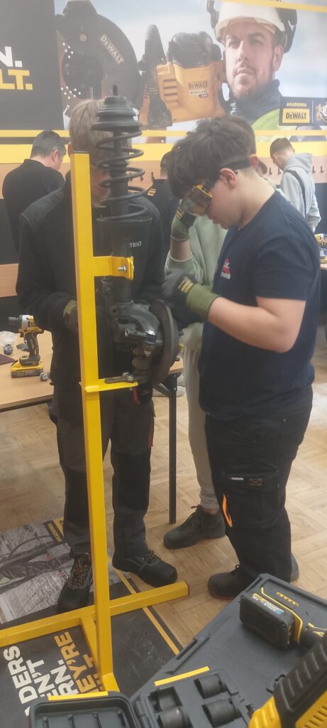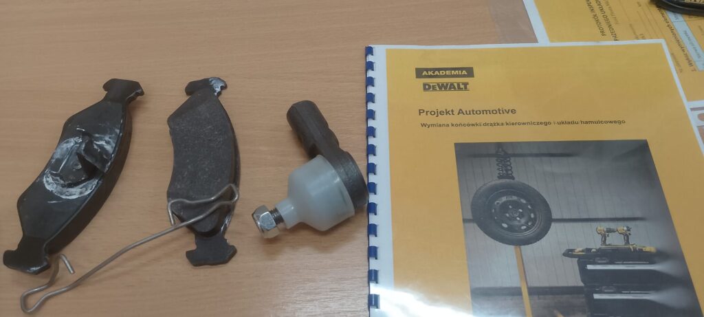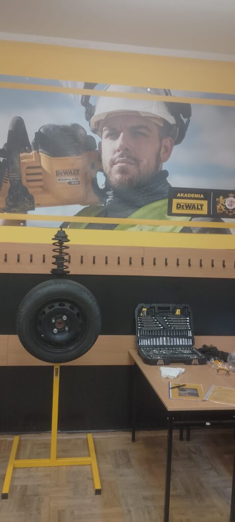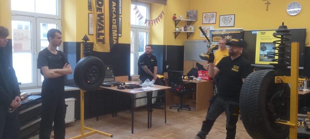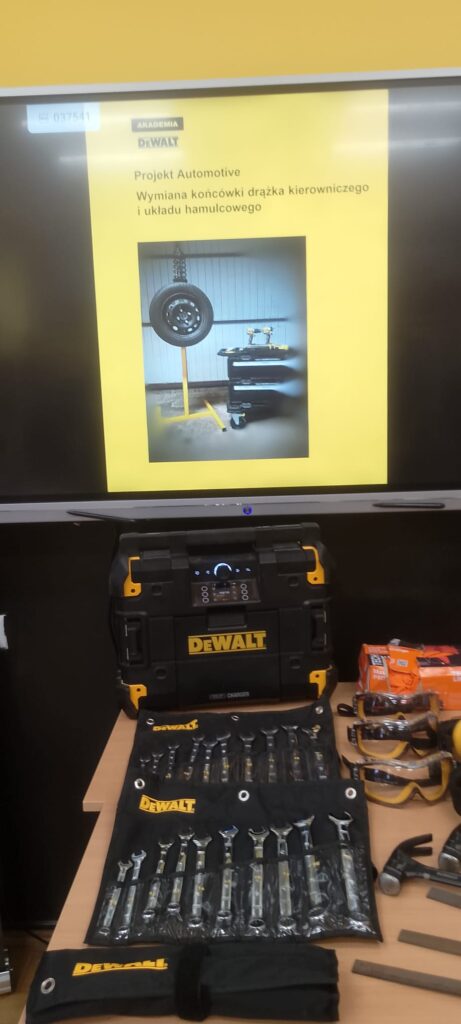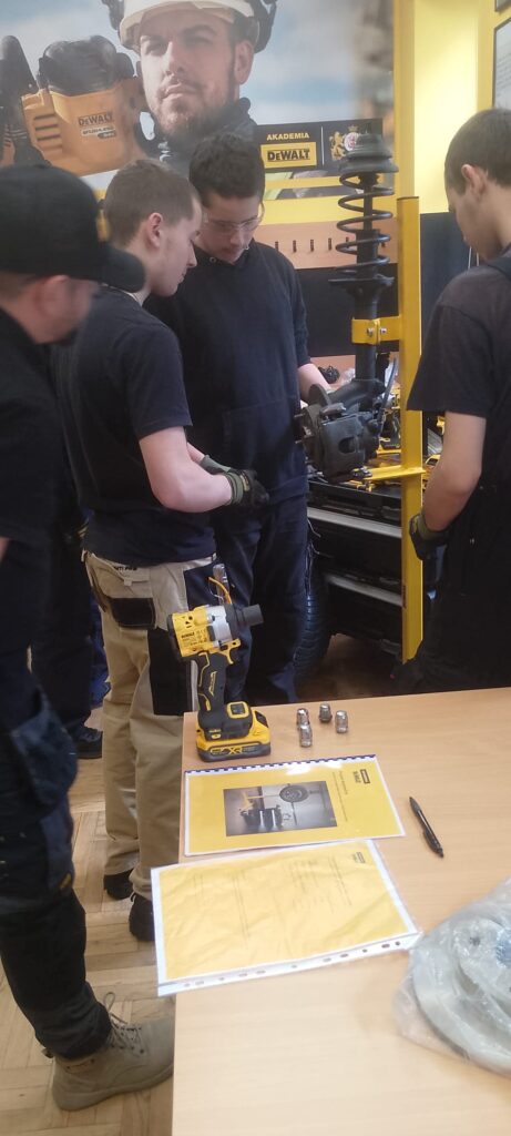 W ramach projektu Akademii DeWolta® zrealizowano dzisiaj w naszej szkole kolejny projekt dla uczniów, polegający na wymianie końcówki drążka kierowniczego oraz elementów układu hamulcowego. Uczniowie klasy pierwszej kształcący się z w zawodach branży mechanicznej pracowali w trzech grupach pod okiem ekspertów DeWolta®. Zajęcia miały charakter warsztatowy i zostały przeprowadzone z wykorzystaniem profesjonalnych narzędzi marki DeWolt®, otrzymanych w ramach projektu.