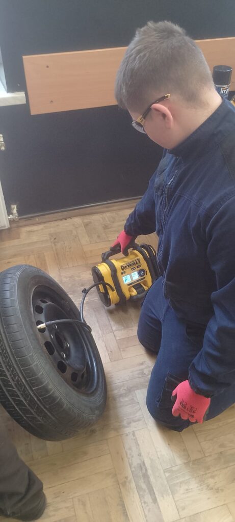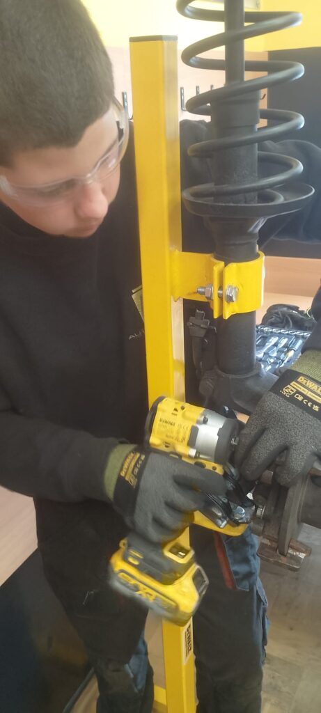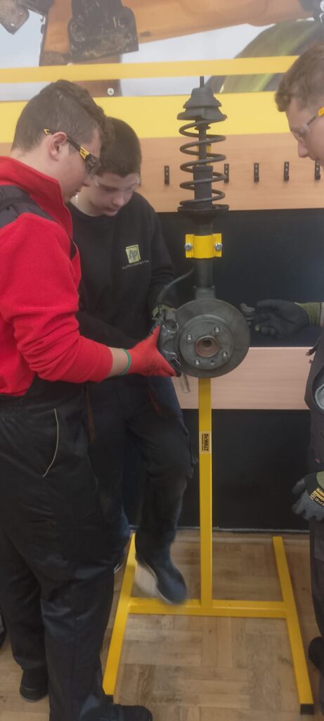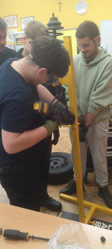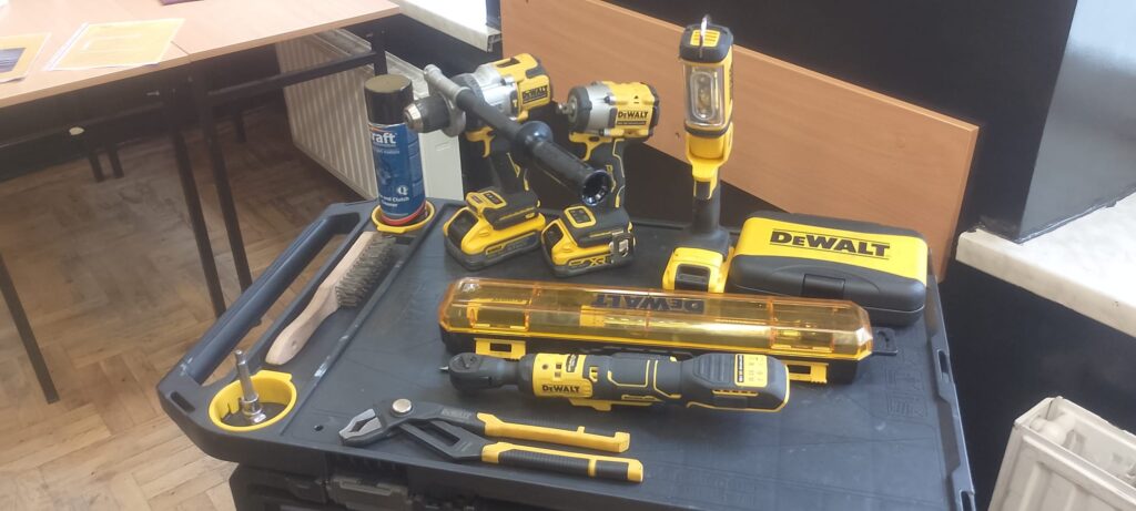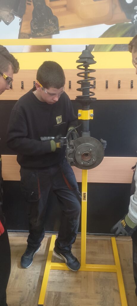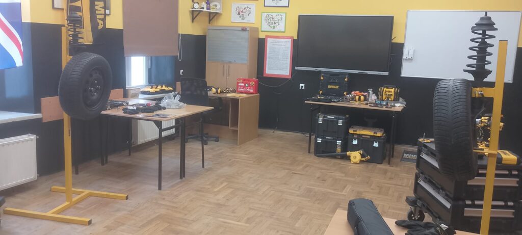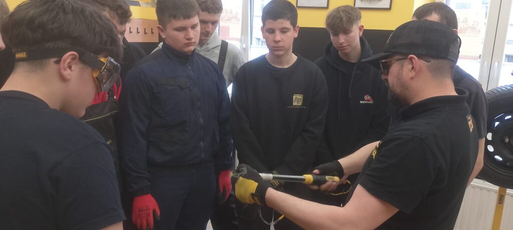 W ramach projektu Akademii DeWolta® zrealizowano dzisiaj w naszej szkole kolejny projekt dla uczniów, polegający na wymianie końcówki drążka kierowniczego oraz elementów układu hamulcowego. Uczniowie klasy pierwszej kształcący się z w zawodach branży mechanicznej pracowali w trzech grupach pod okiem ekspertów DeWolta®. Zajęcia miały charakter warsztatowy i zostały przeprowadzone z wykorzystaniem profesjonalnych narzędzi marki DeWolt®, otrzymanych w ramach projektu.