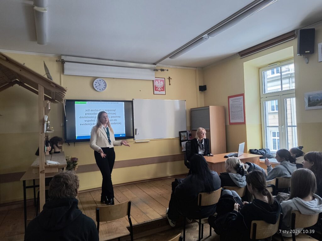 Drugim tematem, poruszanym podczas wykładu, było omówienie zagadnień związanych z prowadzeniem własnej działalności gospodarczej. Ten temat szczególnie zainteresował uczniów, którzy po skończeniu szkoły Branżowej I Stopnia, marzą o prowadzeniu własnej firmy.