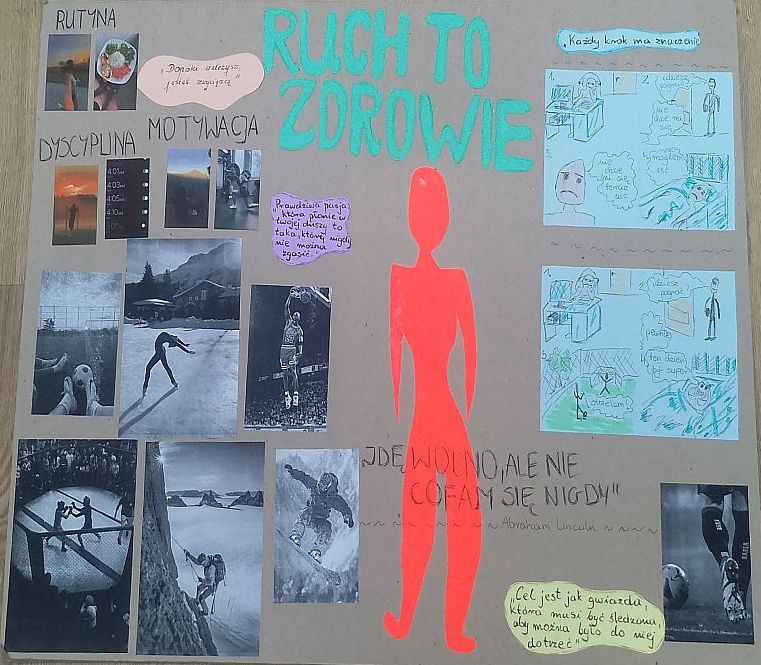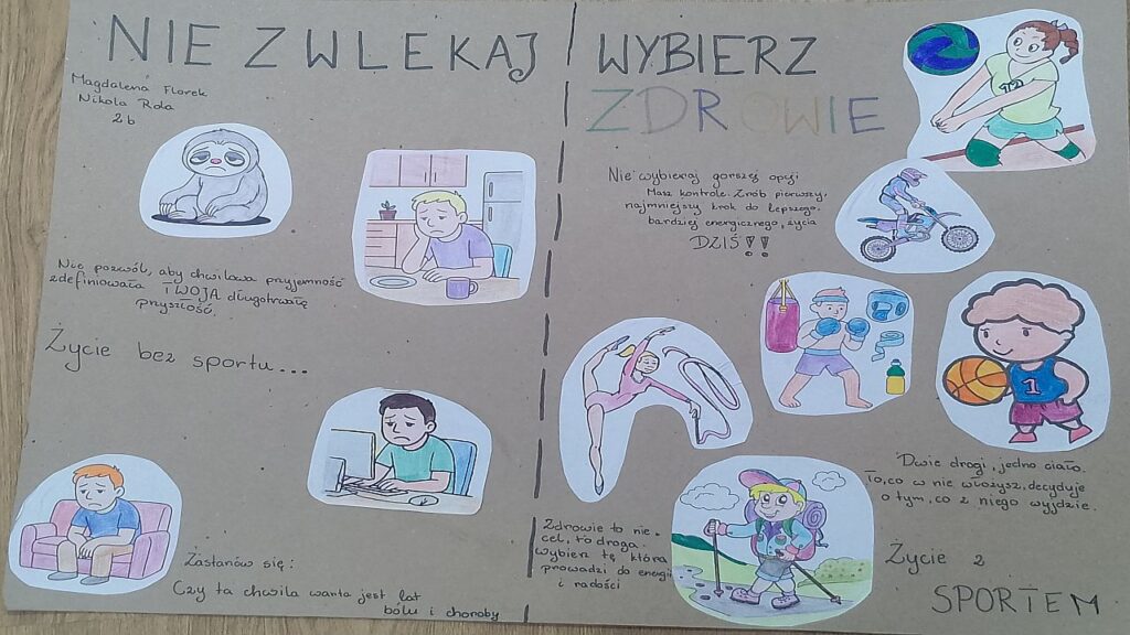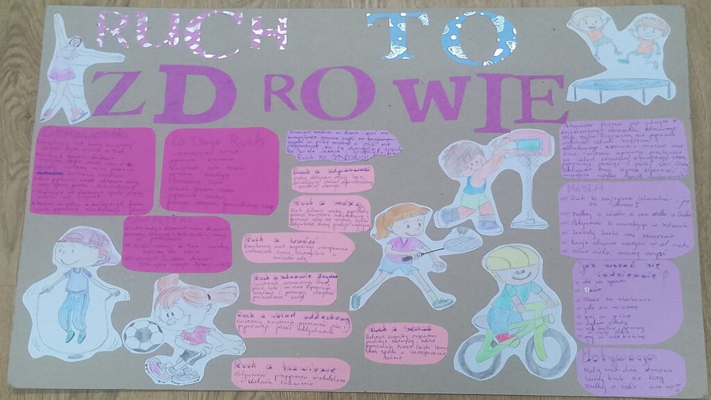 „Ruch to zdrowie” to znane powiedzenie, ponieważ regularna aktywność fizyczna przynosi liczne korzyści zarówno dla zdrowia fizycznego, jak i psychicznego. Wzmocnienie mięśni i kości, poprawa pracy serca i płuc, lepsze krążenie oraz kontrola wagi to tylko niektóre z zalet ruchu. Dodatkowo, aktywność fizyczna pozytywnie wpływa na samopoczucie, redukuje stres, poprawia funkcje poznawcze i pomaga w profilaktyce wielu chorób. Właśnie w trosce o poprawę kondycji fizycznej i psychicznej naszych uczniów zorganizowaliśmy dwa konkursy: „Ruch to zdrowie” – plastyczny oraz „Mój sposób na zdrowie” – fotograficzny. Koordynatorami tych konkursów byli nauczyciele, odpowiednio p. Łukasz Kociubiński oraz p. Anita Waściszakowska.