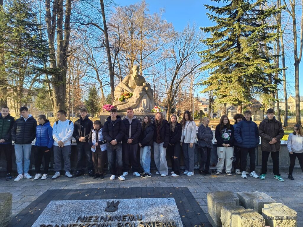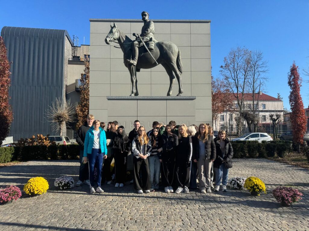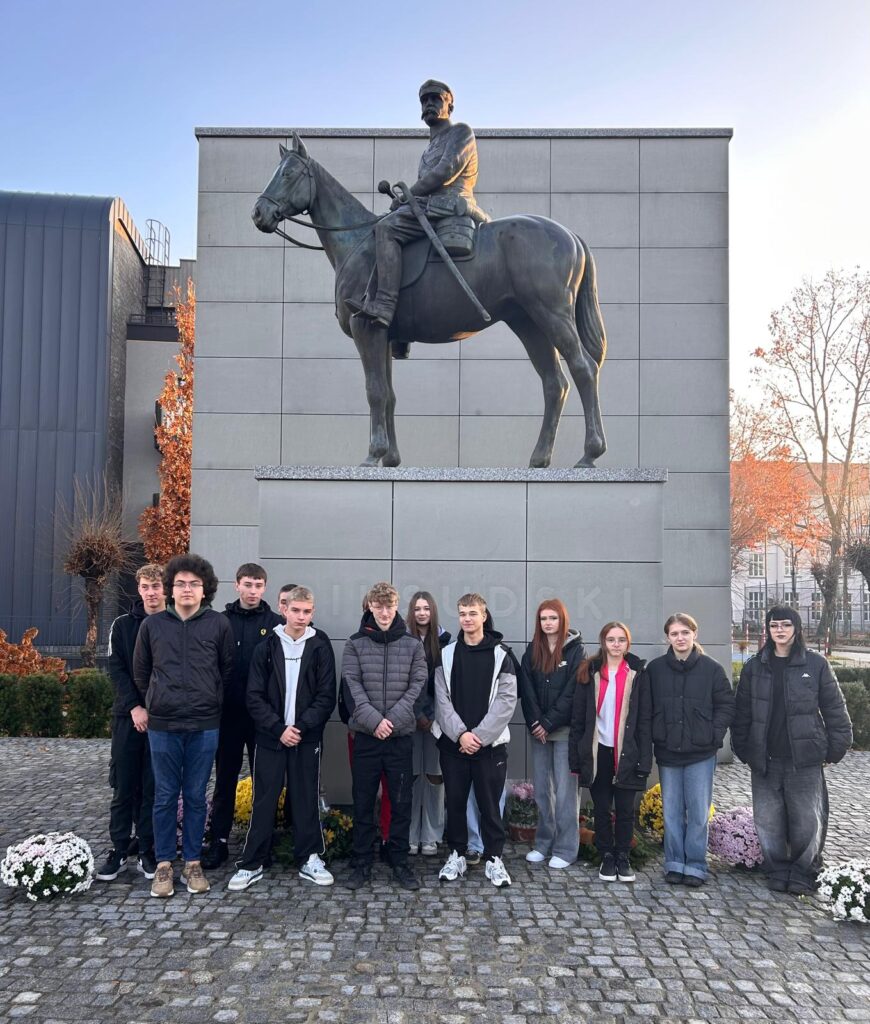 - Uczniowie wraz z wychowawcami udali się na spacer pod pomnik marszałka Józefa Piłsudskiego, gdzie złożyli symboliczny znicz pamięci oraz wykonali pamiątkowe zdjęcie. Był to moment refleksji nad historią naszej Ojczyzny i bohaterami, którzy walczyli o wolność.