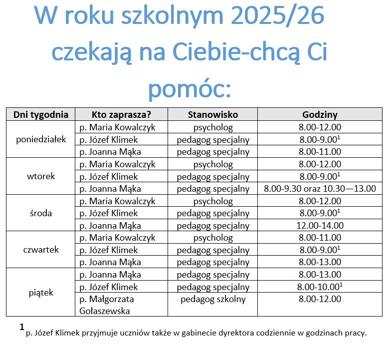 Jeżeli potrzebujesz pomocy, wsparcia, rozmowy – zapraszam Cię w tym czasie do kontaktu telefonicznego – 18 443 69 25 , mailowego (maria.kowalska@szkolacech.onmicrosoft.com) lub on-line.