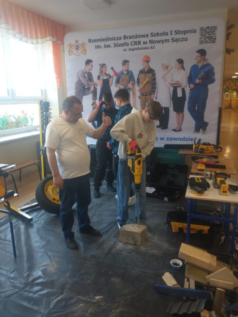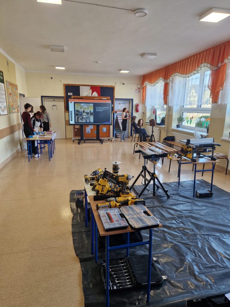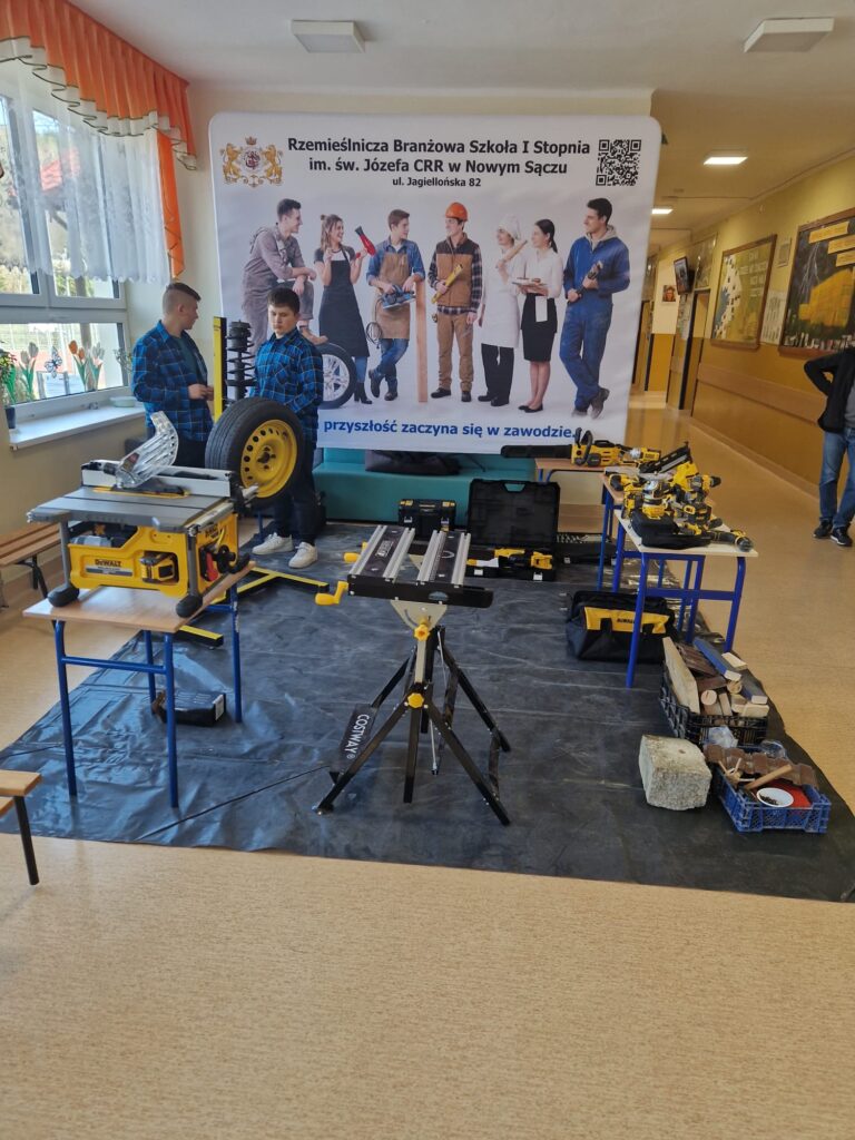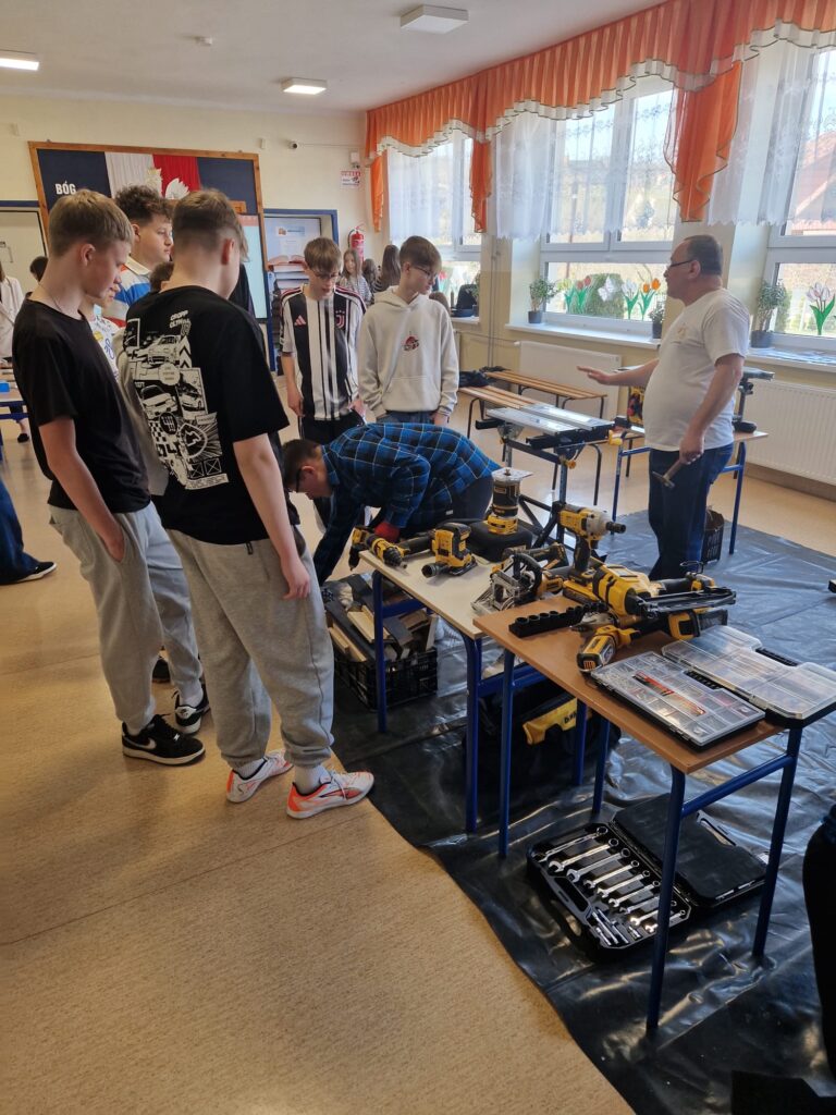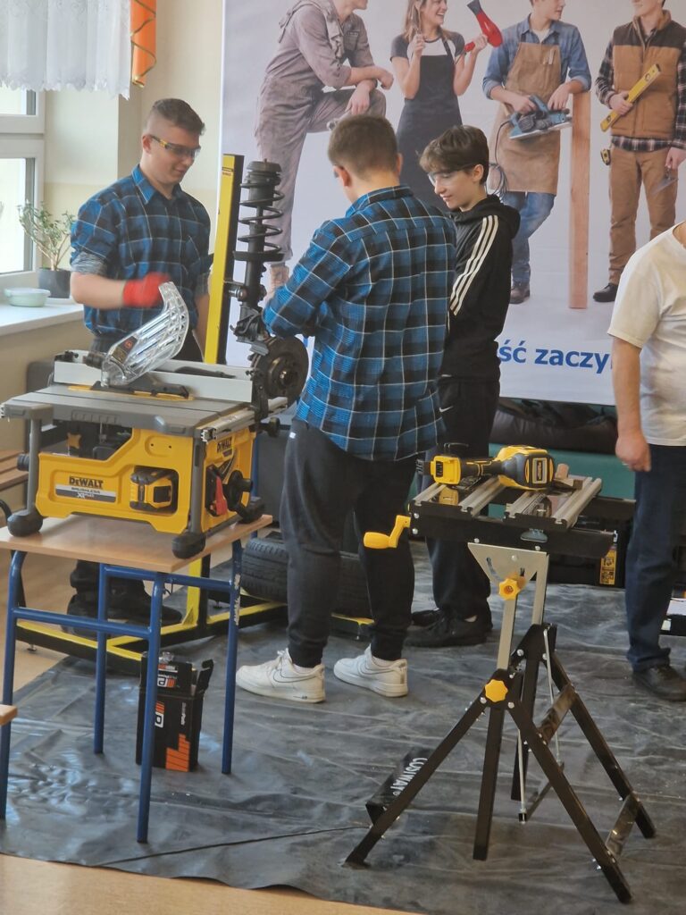 Uczniowie naszej szkoły pod opieka nauczycieli zorganizowali warsztay branżowe w szkołach podstawowych w Podolu i Przydonicy w celu promocji kształcenia zawodowego oraz zaprezentowania oferty edukacyjnej szkoły. W wydarzeniu uczestniczyli uczniowie kierunków: gastronomicznego, fryzjerskiego, mechanicznego, budowlanego oraz stolarskiego. Podczas warsztatów uczniowie mieli okazję zaprezentować swoje umiejętności praktyczne młodszym kolegom i koleżankom. W ramach zajęć odbyły się pokazy przygotowywania potraw, stylizacji fryzur, a także prezentacje prac z zakresu mechaniki, budownictwa i stolarstwa. Szczególnym elementem wydarzenia był pokaz zastosowania narzędzi marki DeWalt®, który wzbudził duże zainteresowanie uczestników. Warsztaty spotkały się z bardzo pozytywnym odbiorem w obu szkołach. Uczniowie szkół podstawowych chętnie angażowali się w proponowane aktywności, zadawali pytania i wykazywali duże zainteresowanie prezentowanymi zawodami. Wydarzenie było również doskonałą okazją do promocji szkolnictwa branżowego, narzędzi najnowszej generacji firmy DeWalt® oraz zachęcenia młodzieży do wyboru ścieżki kształcenia zawodowego.