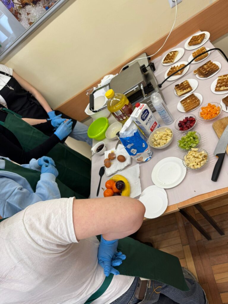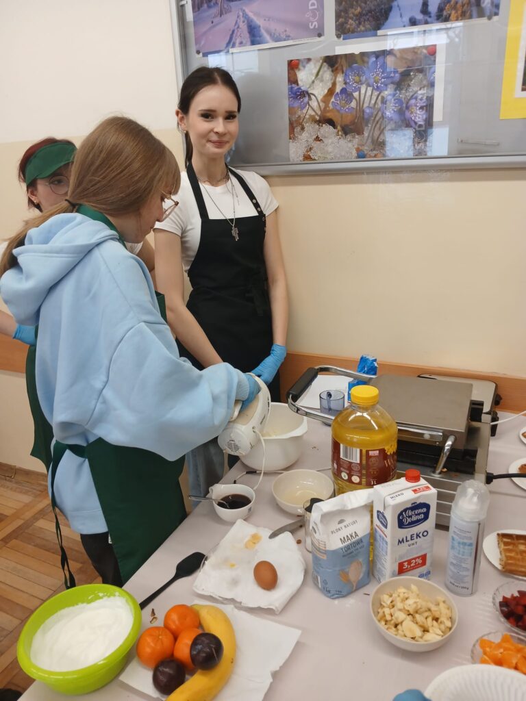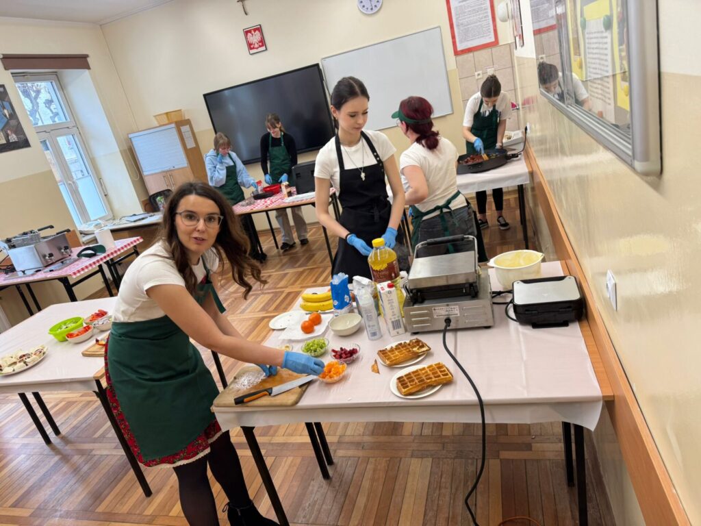 gastronomia –  gdzie uczennice  przygotowały do degustacji gofry z bitą śmietaną i owocami, pizzerinki, tortille, oraz kiełbaski na ciepło.