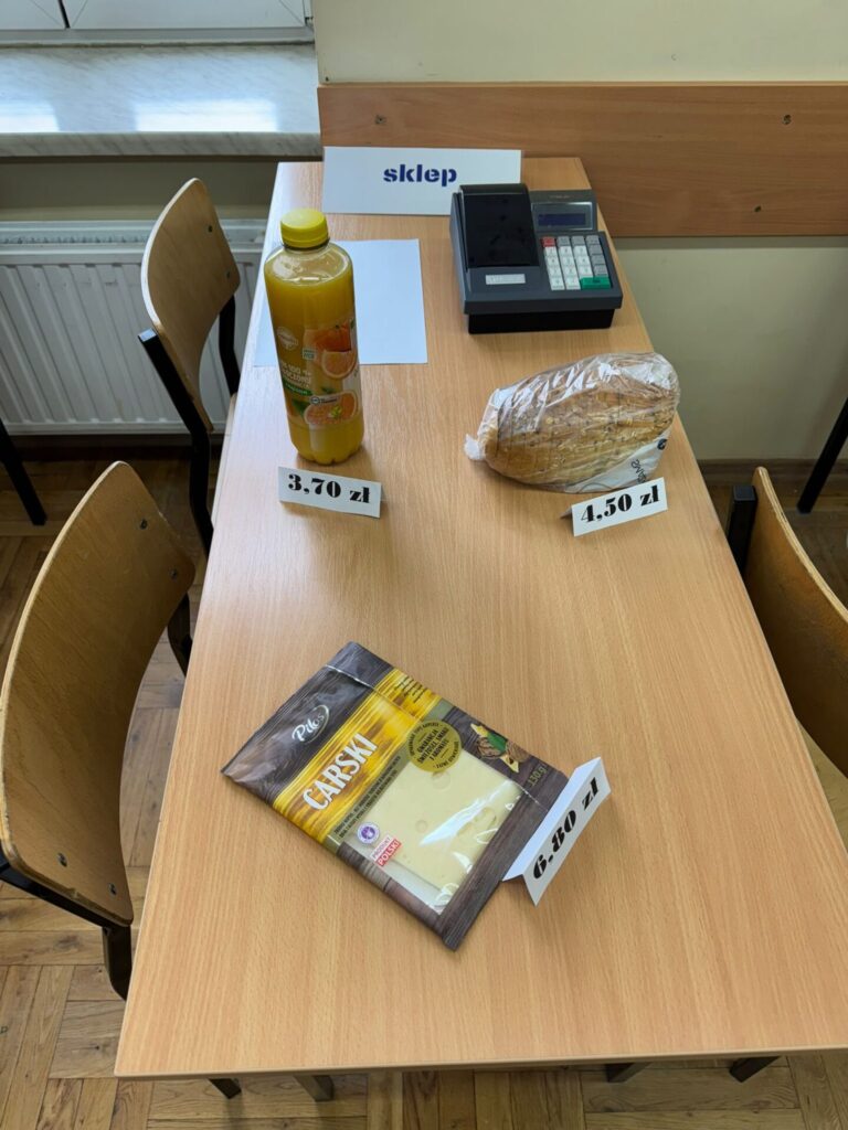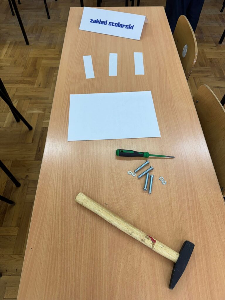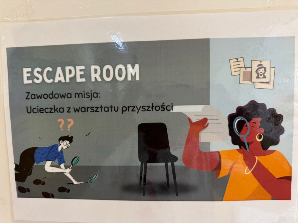 Odwiedzający nas uczniowie mieli również okazję wziąć udział w grze Escape room „Zawodowa misja: Ucieczka z warsztatu przyszłości”, w której wykonywali zadania charakterystyczne dla zawodów np. kelnera, sprzedawcy, kucharza. Po rozwiązaniu zadania otrzymywali kod do otwarcia sejfu z kolejnym ćwiczeniem.